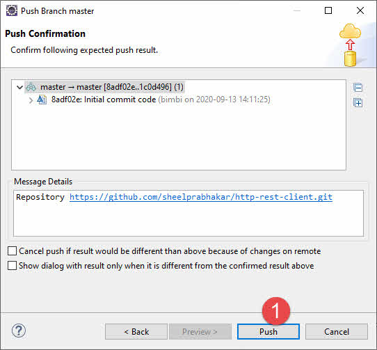 It will open the push confirmation dialog. eclipse git push confirmation boxClick the Push button and code will be pushed to the remote git repository.